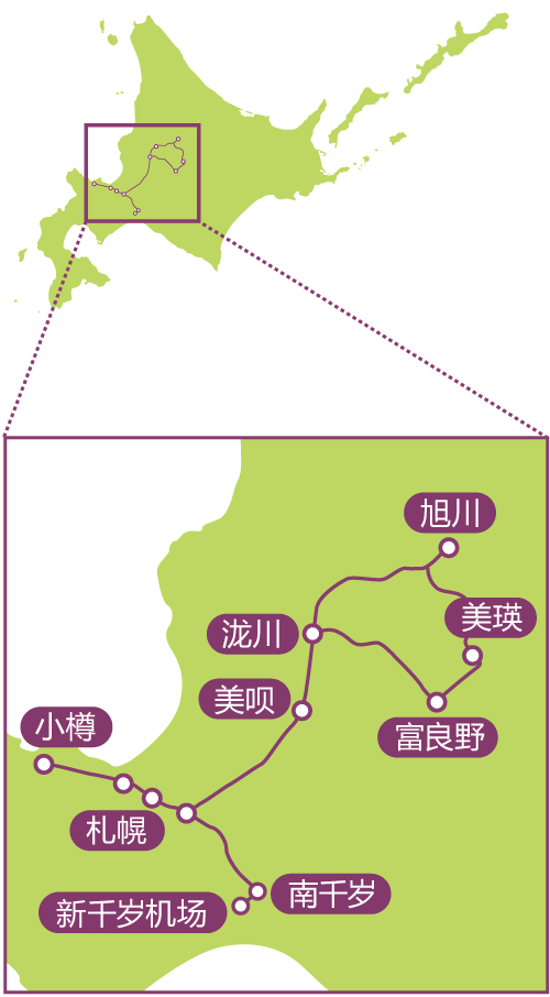 畅游新千岁机场-札幌-小樽-富良野-美瑛-旭川之间的区域!可自由乘坐指定区域内的列车!