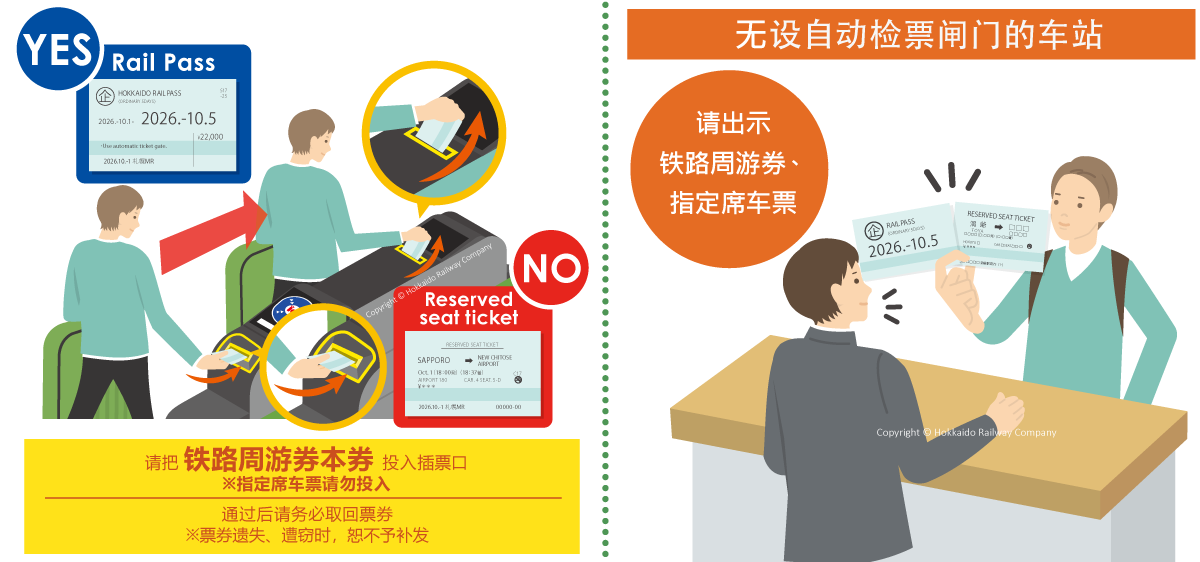 请把铁路周游券本券放入自动检票闸门。通过后请取回票券。票券遗失〈含遭窃时〉,恕不予补发,也不能再次购票。