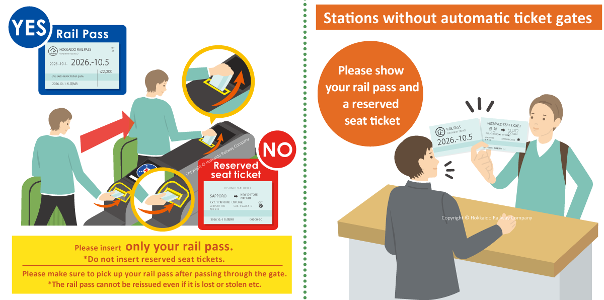 Please insert only your rail pass into the automatic ticket gate. Please make sure to pick up your rail pass after passing through the gate. The rail pass cannot be reissued or repurchased even if it is lost (or stolen).