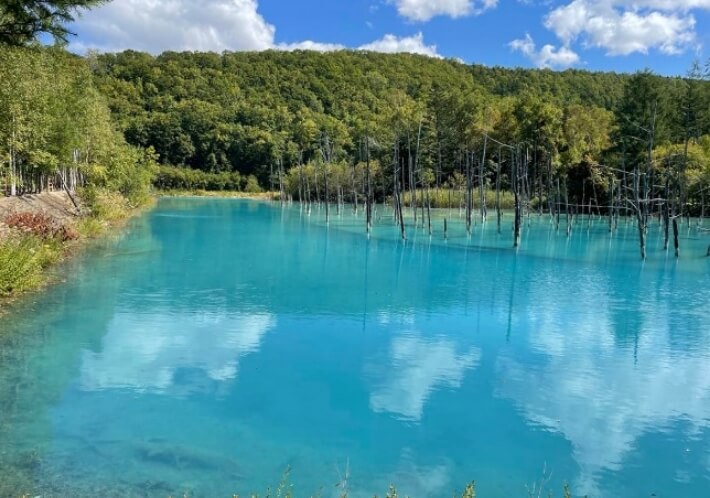 十勝岳の防災工事の際、堰堤にたまった水が、不思議なほど青い色をたたえ、立ち枯れのカラマツとあいまって幻想的な風景に。いつしか「青い池」とよばれるようになったこのスポットは、美瑛観光の定番として多くの観光客を魅了し続けています。