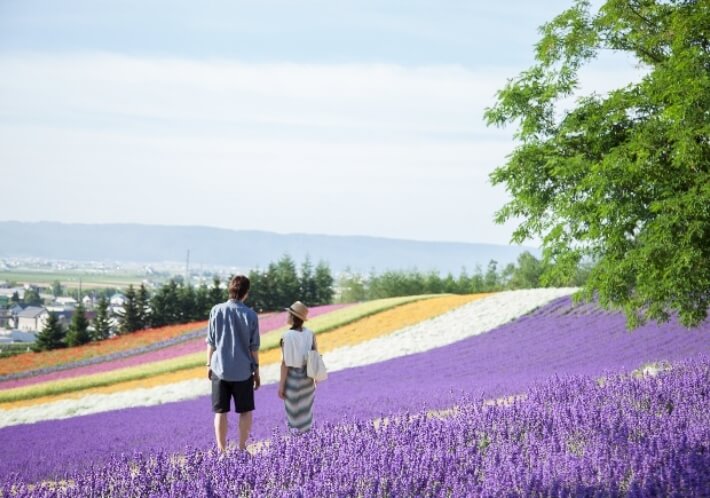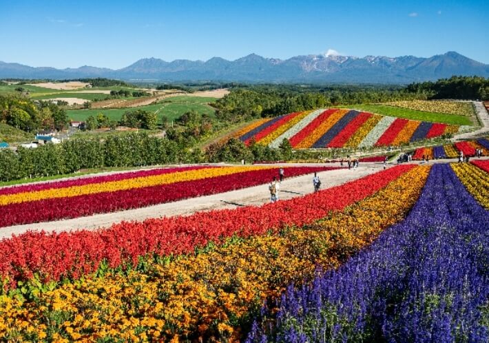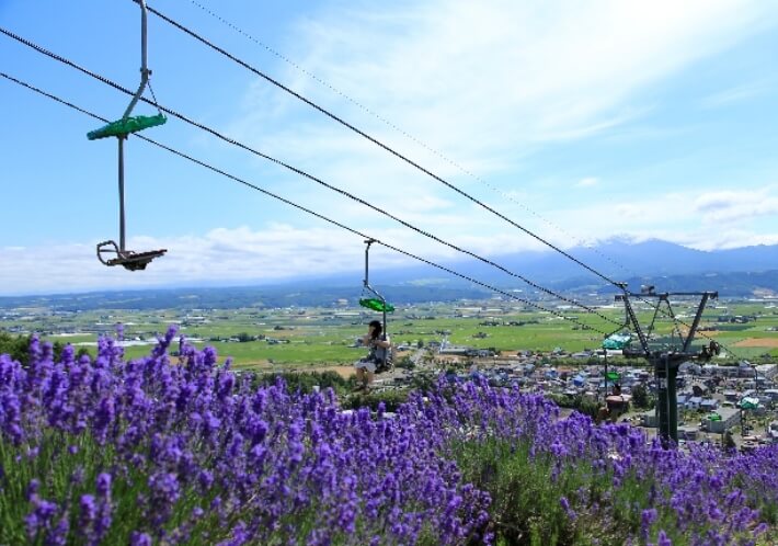 一面に広がる3種類のラベンダーや鮮やかな一年草の花畑を眼下に眺めながら、約5分半の観光リフトで北星山の頂上へ。十勝岳連峰と田園風景が広がる中富良野らしい景色を堪能できます。富良野地方の夏をつげるお祭り、ラベンダーまつり&花火大会の会場でもあります。